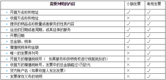 之前我们介绍了开据常用发票的内容(详情请参考:来德国经商:进项和销项发票),下面我们来看小额发票,并将小额发票需要列明的内容与常规发票进行对比。