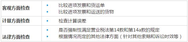进项发票通常发生在公司已经收到货物的情况。通常销项发票是和货物同时放在一起的。每个进项发票需要在支付前,客观方面,计量方面以及法律方面进行检查: